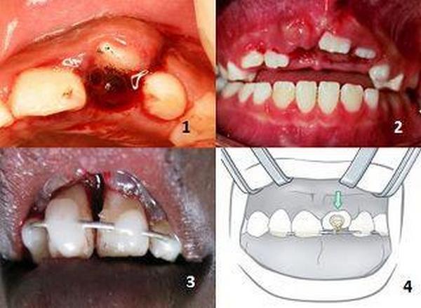 Utiskivanje zuba moze da bude tako izraženo da je zub čak potpuno potisnut ispod desni(slika 1).