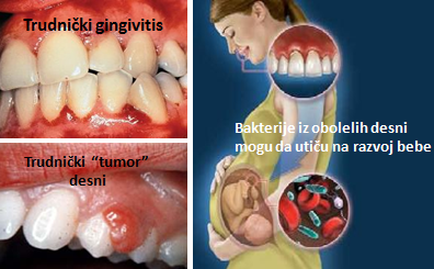Tokom trudnoće dolazi do promene nivoa raznih hormona, neretko zbog toga trpe desni i meka tkiva oko zuba. Dolazi do otoka. Zbog toga se hrana tu lakše zadržava i teže eliminiše. Javlja se upala desni kao posledice. DOBRA HIGIJENA umanjava taj problem,i neophodan je dodatni napor i strpljenje.