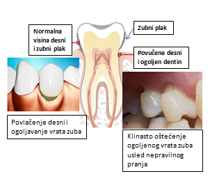 Ogoljavanje dentina u predelu vrata zuba može da se dogodi i usled zapaljenja desni i korišćenja tvrdih ili starih četkica i nepravilnih i grubih pokreta prilikom pranja zuba. Zapaljene i otečene desni su posebno osetljive. Preporučuju se meke ili ultra meka četkica (soft ili ultrasoft) koja se menja najduže posle mesec dana. Najbolje je da prvo stomatolog demonstrira i kontroliše pravilnu tehniku četkanja. Ukoliko se duže vreme koristi neodgovarajuća četkica mogu se stvoriti dublja oštećenja u vratu zuba koja se nazivaju KLINASTE EROZIJE.