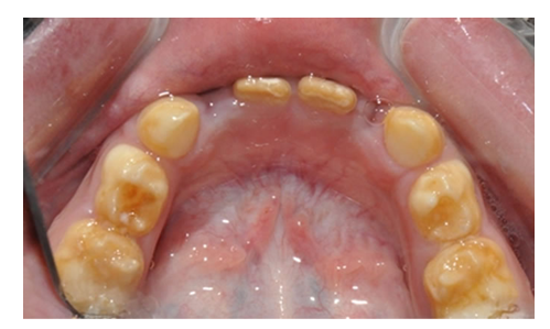 Stalni sekutići(desno) je povređen od strane mlečnog zuba u toku razvoja tako da je izostala izgradnja gleđi