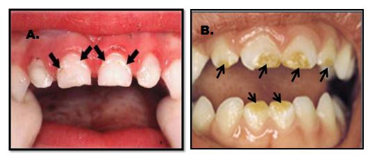 Vrlo je važno da se razlikuje karijes od razvojnog defekta. Karijes se pojavljuje kao bela mrlja na prethodno normalnoj gleđi i to pre svega uz ivicu desni. Rezvojni defekat je uglavnom na drugim površinama, gde se karijes ne javlja. (Slika 4. i 4b)